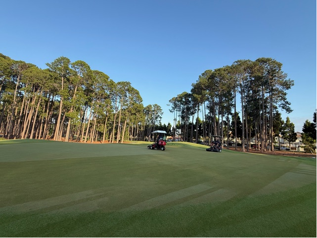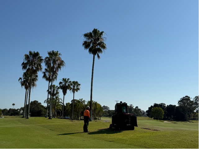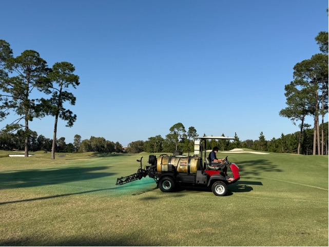 Spot sprayed selective herbicide on The Palms golf course greens to remove unwanted grass weeds
