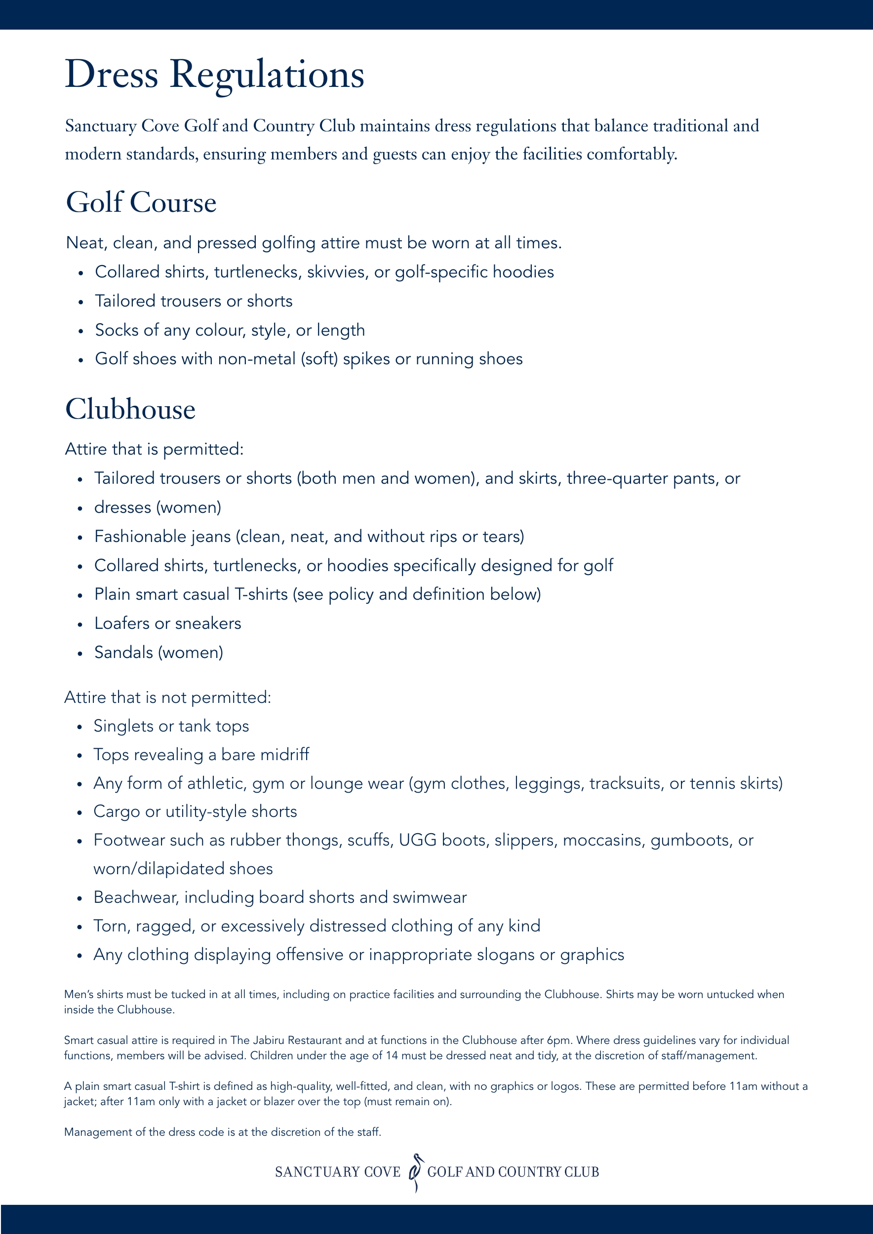 Sanctuary Cove Golf and Country Club appreciates the cooperation of members, guests, and visitors in upholding these standards, which help maintain both the welcoming atmosphere and prestige of our Club.
